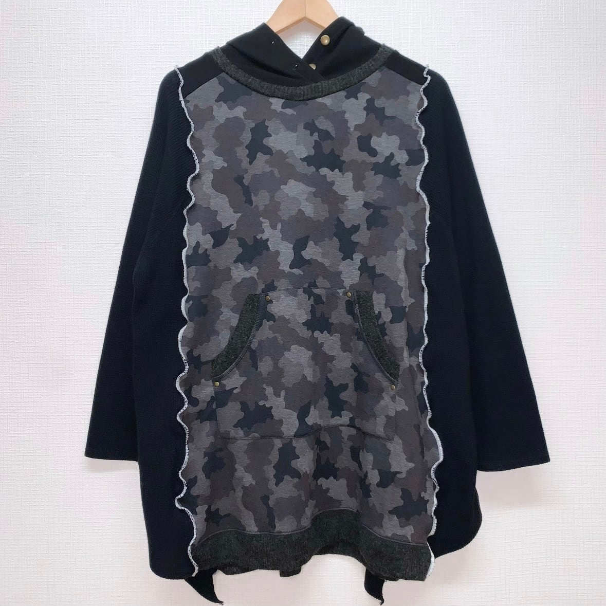 モノクロ迷彩フードトップス